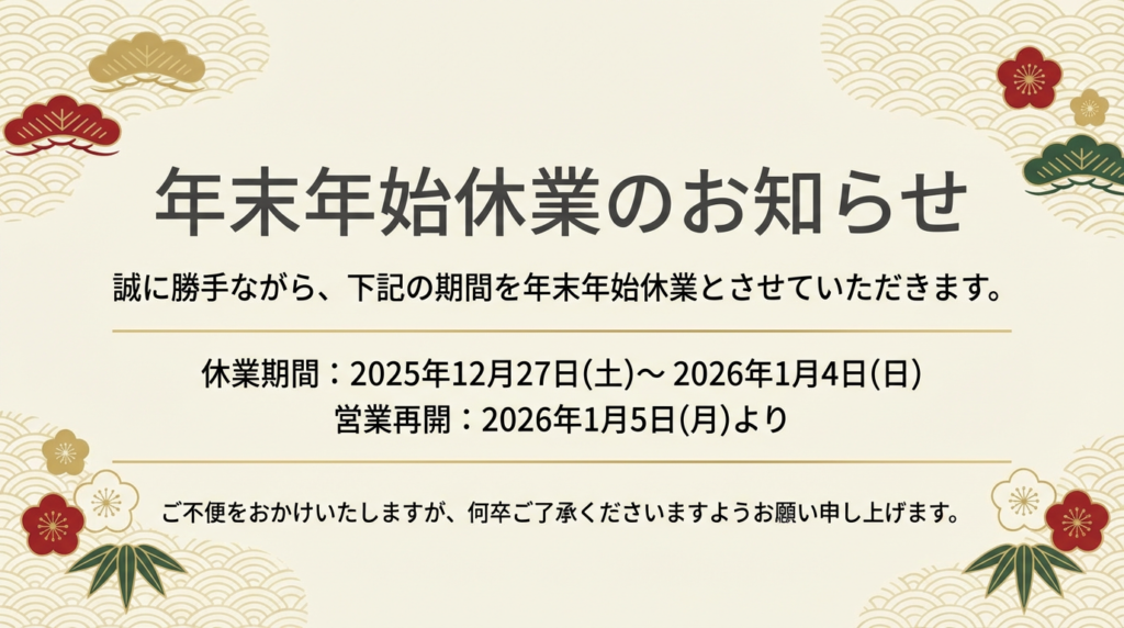 年末年始休業のお知らせ 2025年12月27日(土) ~ 2026年01月04日(日)